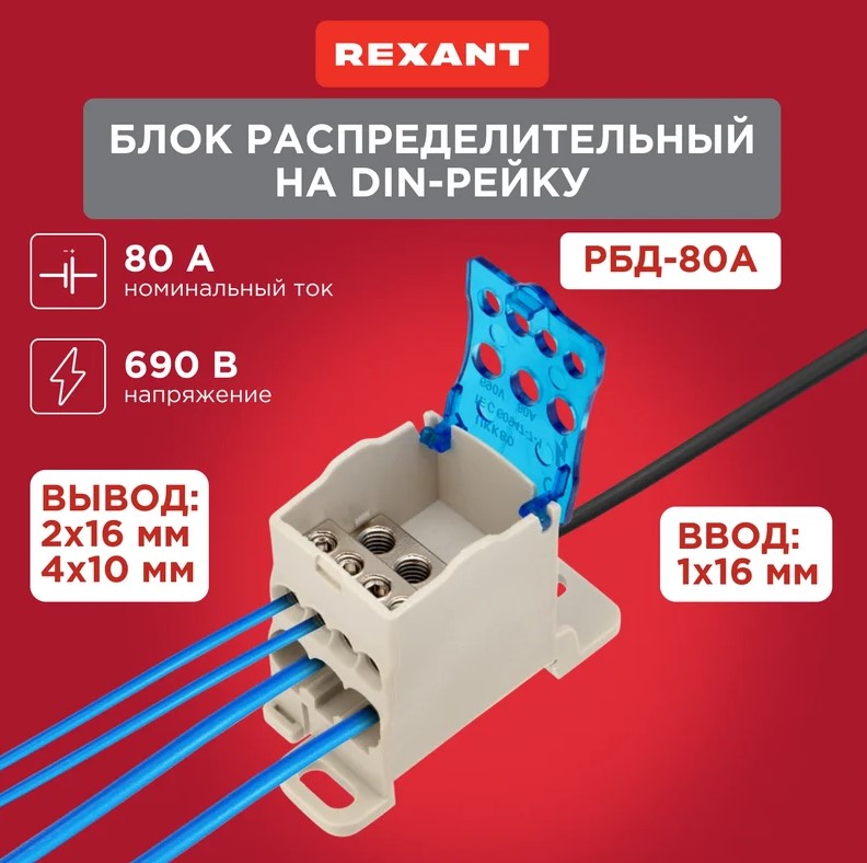 Блок распределительный РБД-80А на DIN-рейку REXANT, 11-2000