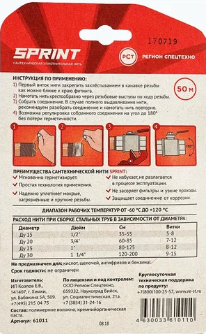 Нить SPRINT 50 м - сантехническая уплотнительная нить для герметизации резьбовых соединений. Первая в мире нить со сменными катушками. Имеет плоское сечение, более 280 микронитей и улучшенную пропитку, разработанную Сантехмастер Групп. Подходит для срочного ремонта и монтажа. Применяется для резьб из любого материала. Благодаря сменным катушкам бокс с нитью можно использовать многократно, докупив расходники - сменные катушки, которые продаются отдельно.